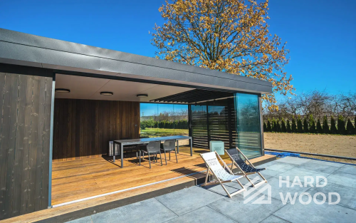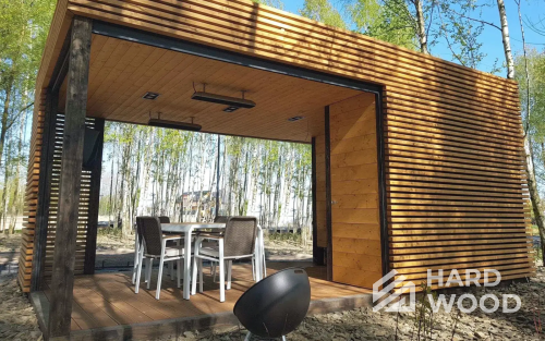 Полуоткрытая — золотая середина: экраны от ветра, продуманная геометрия кровли, удобная посадка на 8–12 персон. Подходит для барбекю и компактных печных комплексов.